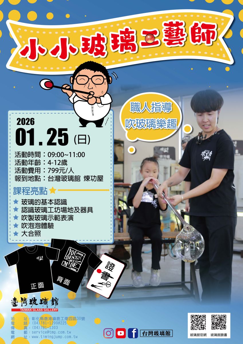 4. 活動當天,請提前10分鐘至臺灣玻璃舘-煉功屋吹玻璃教室完成報到,為了維護大家的權益,活動將準時開始不等待喔 !