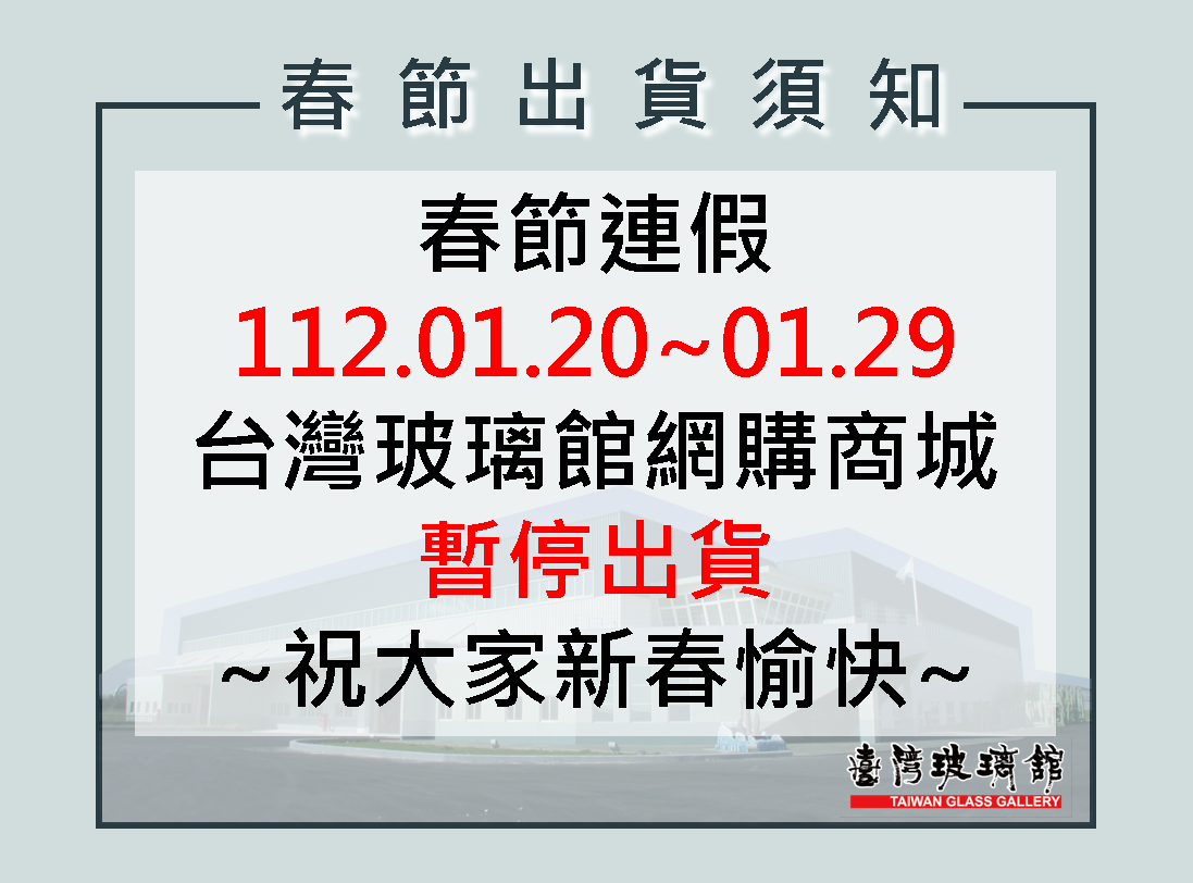 台灣玻璃館為體恤物流人員辛勞, 春節期間(1/25~2/2)玻璃館暫不提供寄送服務, 統一於春節後(2/3)開始寄送,如有不便敬請見諒 台灣玻璃館全體人員祝您新春愉快~